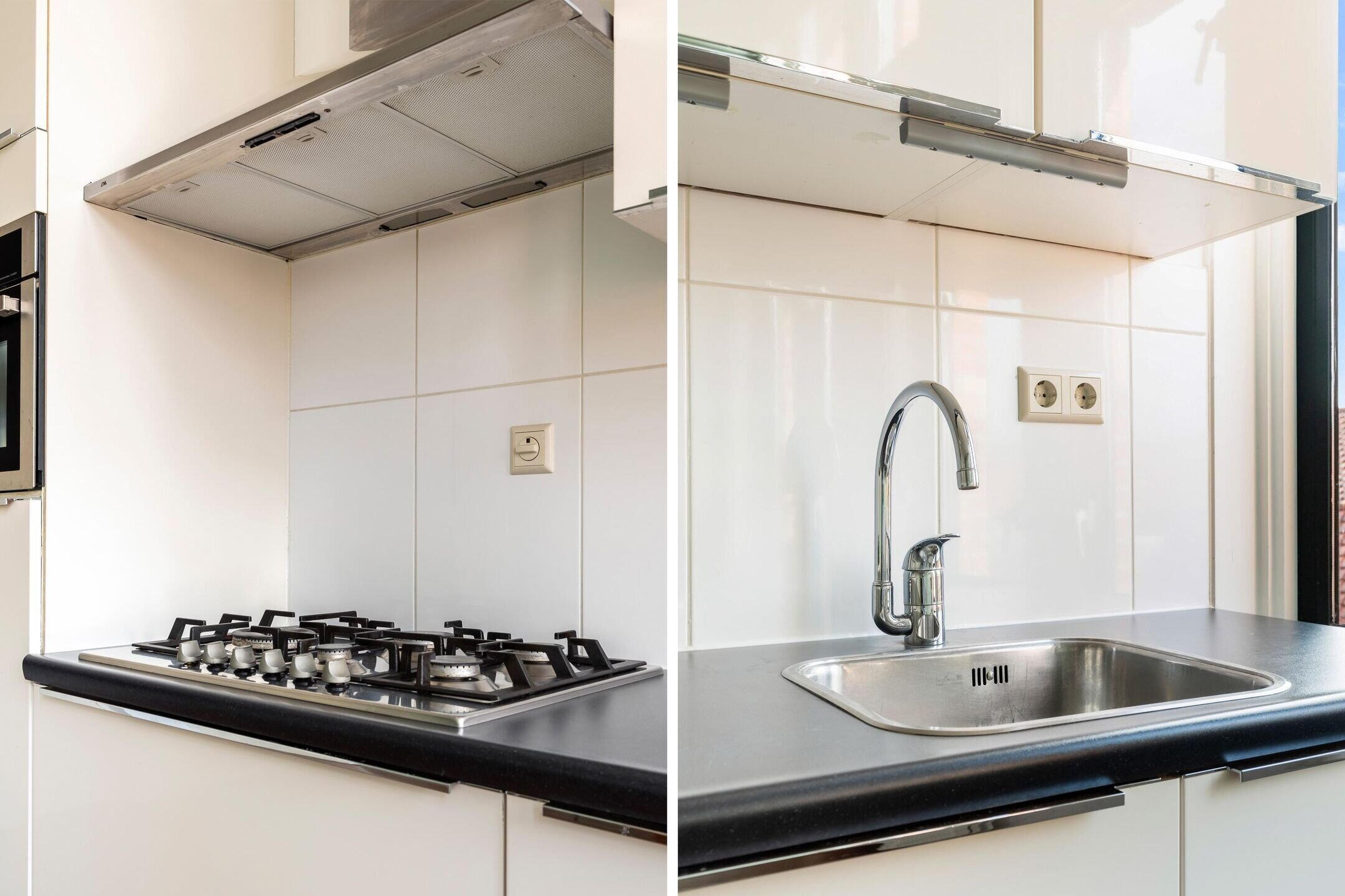 De ruime woonkamer is zeer licht door de vele ramen. De keuken is groot genoeg voor een eettafel. De keuken is voorzien van alle gemakken, zoals een vaatwasser, koel-vriescombinatie en een vijfpits gasfornuis. Er is veel werkruimte en veel kastruimte.