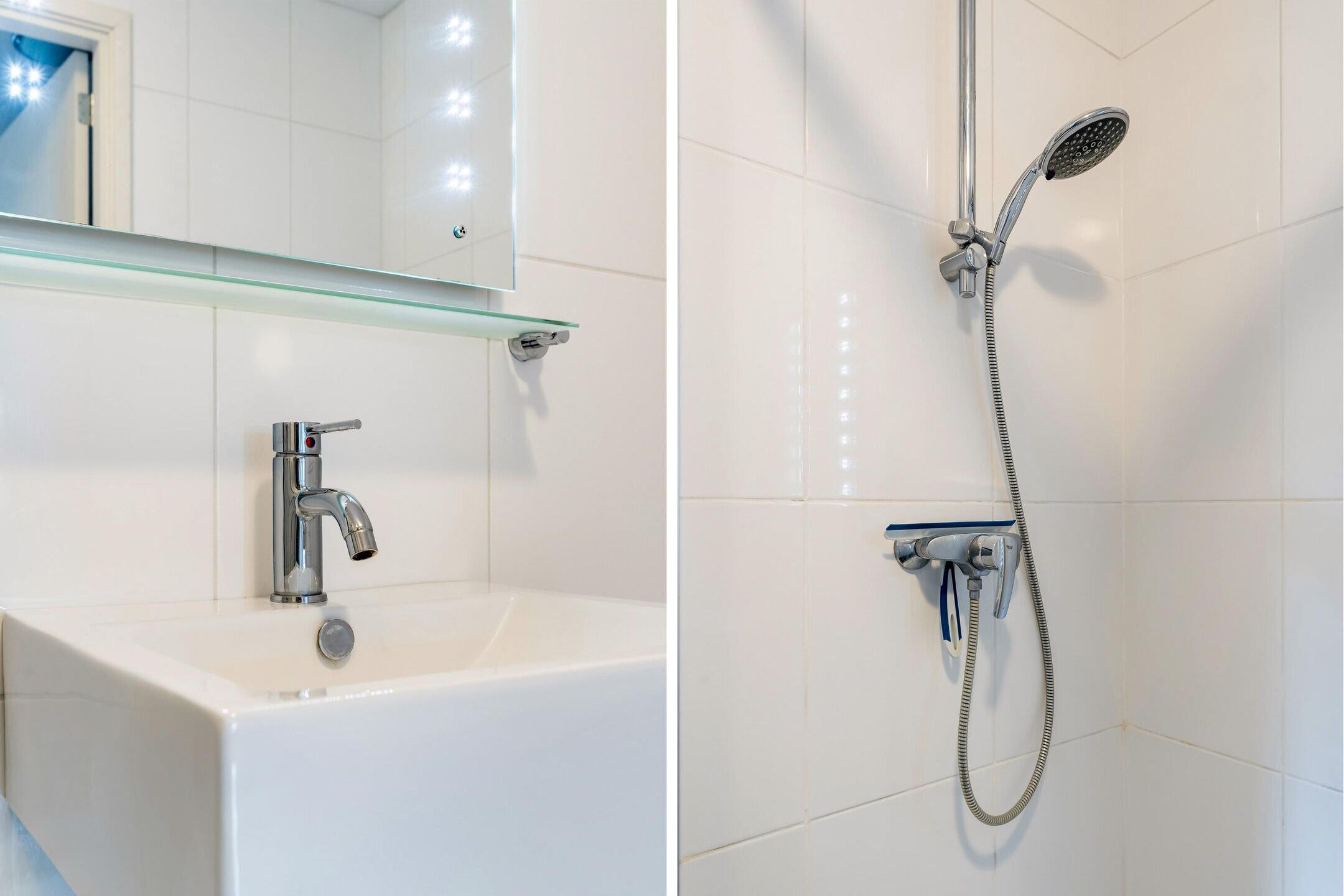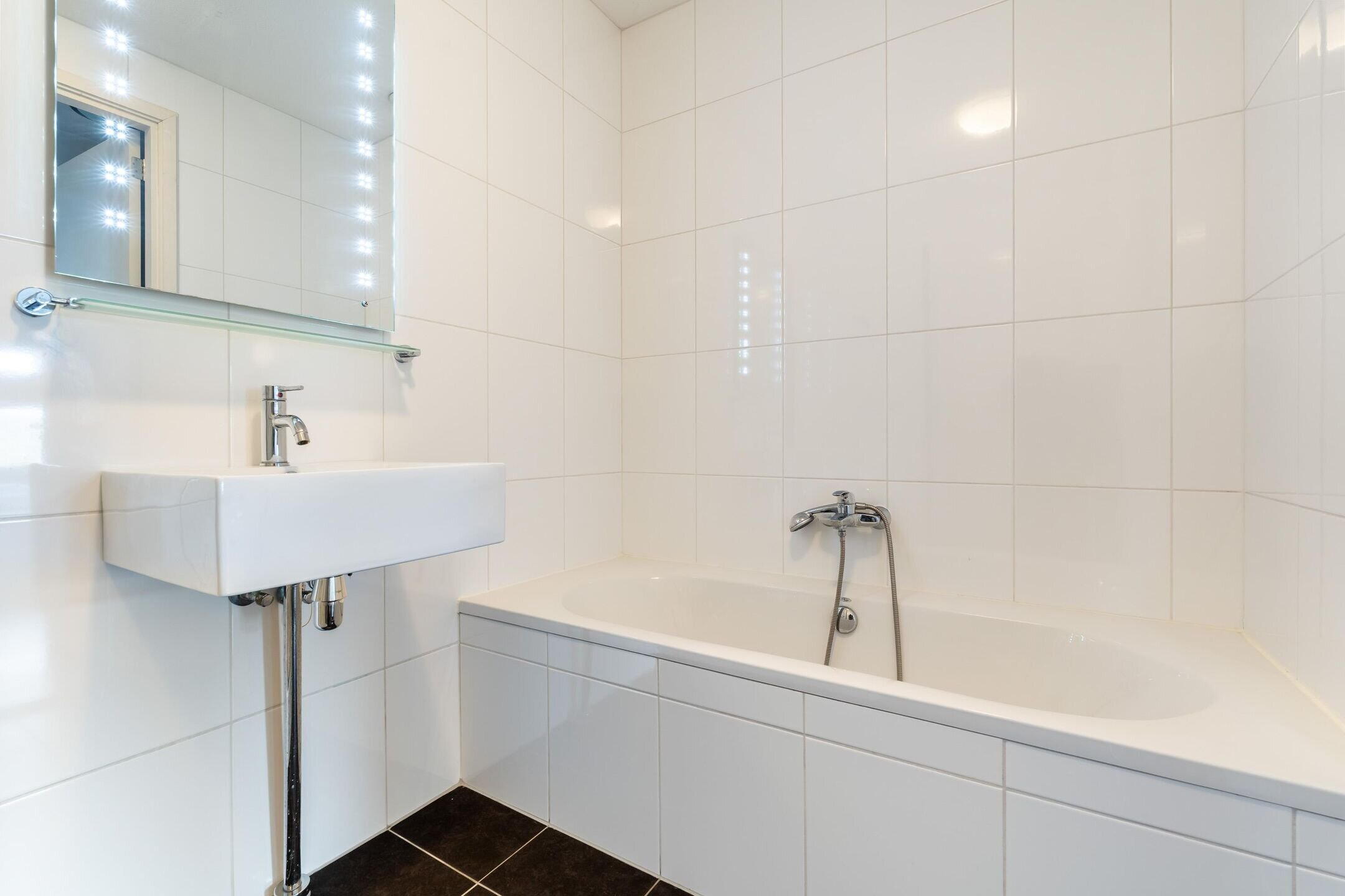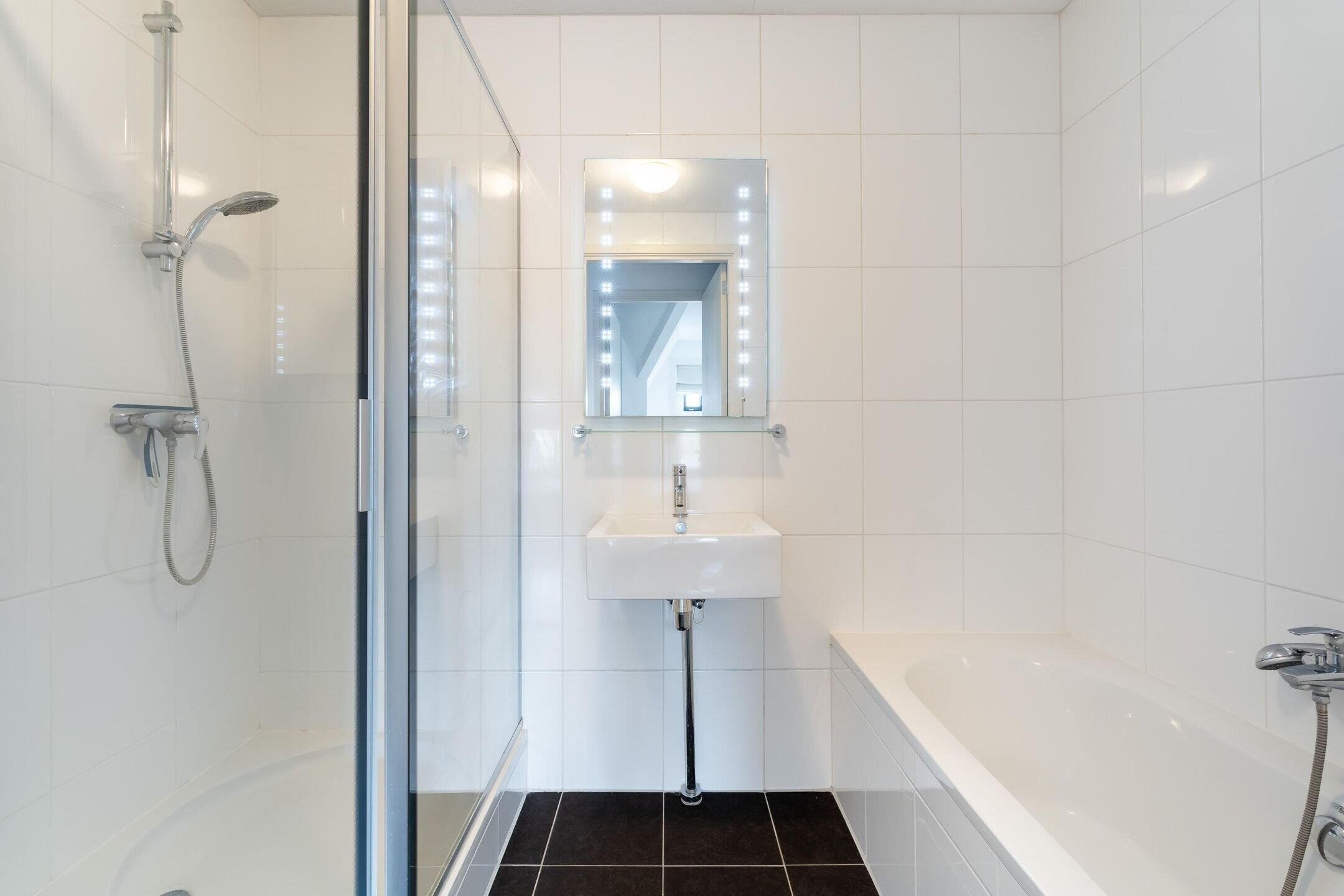 De badkamer heeft een moderne uitstraling. Er is een ligbad, een aparte douche met glazen cabine, een wastafel met verlichte spiegel en een handdoekradiator. Lees de volledige omschrijving
